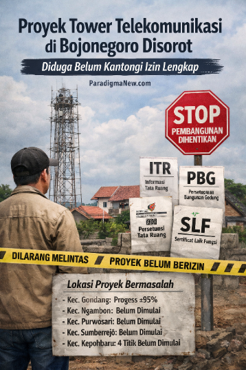 Bojonegoro, Paradigmanew.com – Sejumlah proyek pembangunan menara telekomunikasi di Kabupaten Bojonegoro menuai sorotan publik. Proyek-proyek tersebut diduga tetap berjalan meski belum mengantongi perizinan secara menyeluruh sebagaimana diatur dalam ketentuan peraturan perundang-undangan dan peraturan daerah.